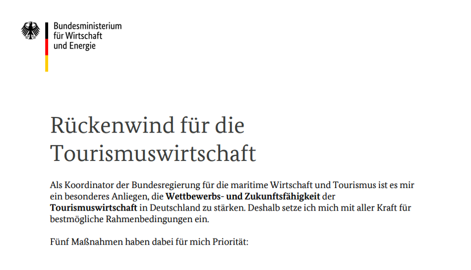 Unter dem Titel “Rückenwind für die Tourismuswirtschaft” benennt Dr. Christoph Ploß, Koordinator der Bundesregierung für maritime Wirtschaft und Tourismus, fünf prioritäre Maßnahmen, für die er sich in dieser Legislatur in der Bundesregierung einsetzt, um die Wettbewerbs- und Zukunftsfähigkeit der Tourismuswirtschaft in Deutschland zu stärken.