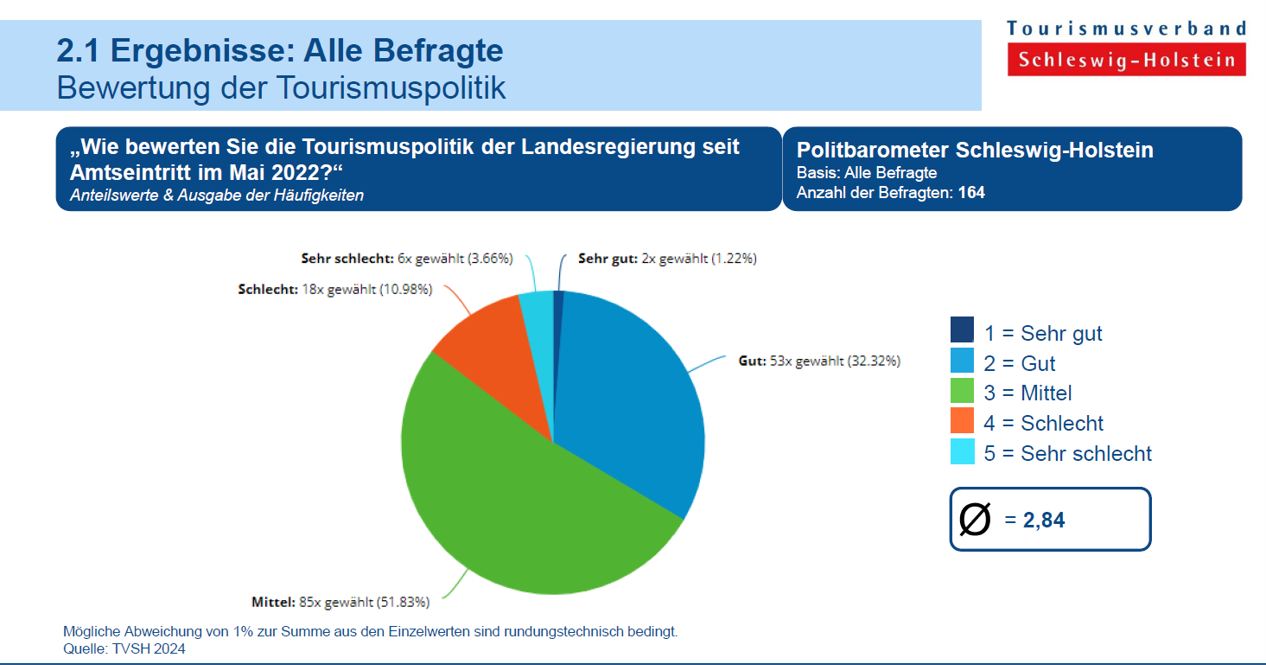 Zum siebten Mal wurde 2024 die Studie zur Einschätzung der tourismuspolitischen Arbeit der Landesregierung in Schleswig-Holstein vom TVSH durchgeführt. Schwerpunkte der Befragung waren die tourismuspolitische Wahrnehmung, die Veränderung der Tourismuspolitik durch die amtierende Landesregierung (seit 2022), die Bewertung und Erwartungen an die Tourismusstrategie Schleswig-Holstein 2030 sowie das Tourismusbewusstsein der politischen Akteure und der Bevölkerung im Land.